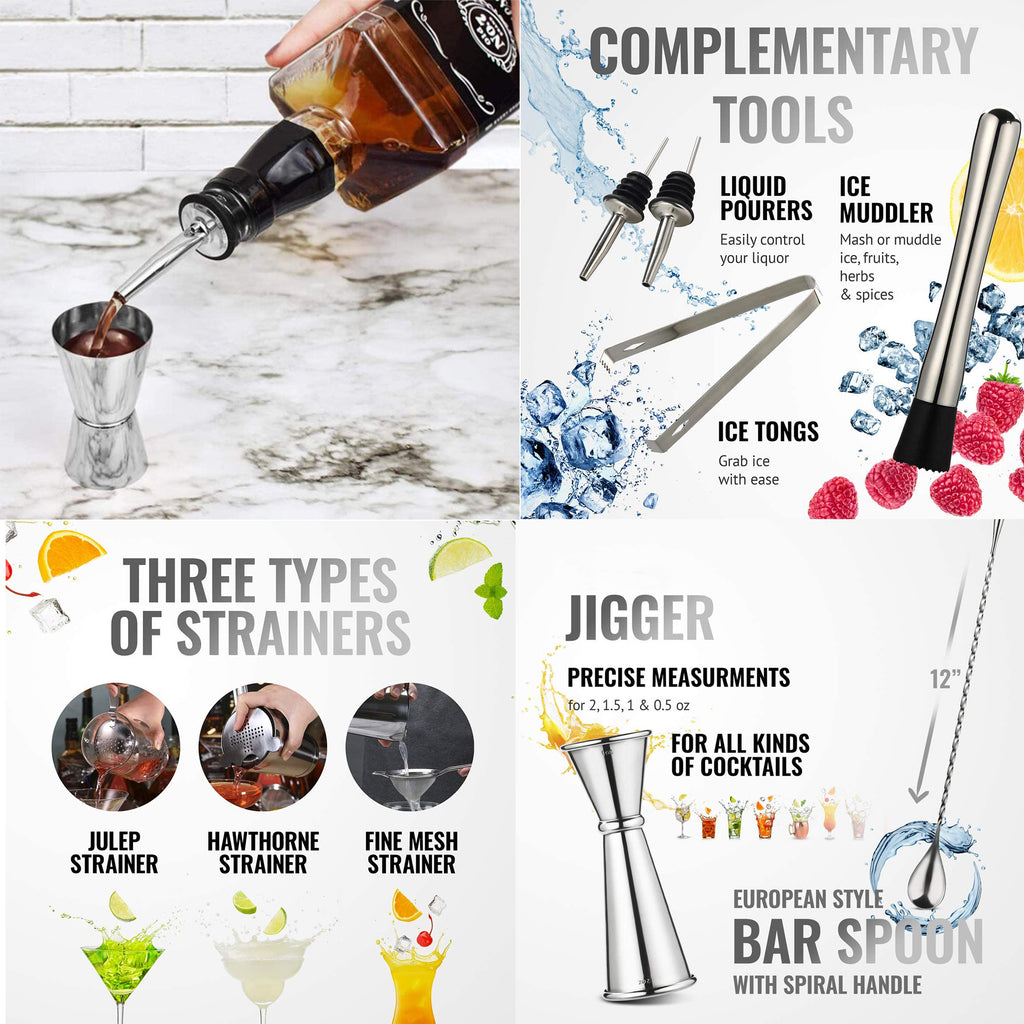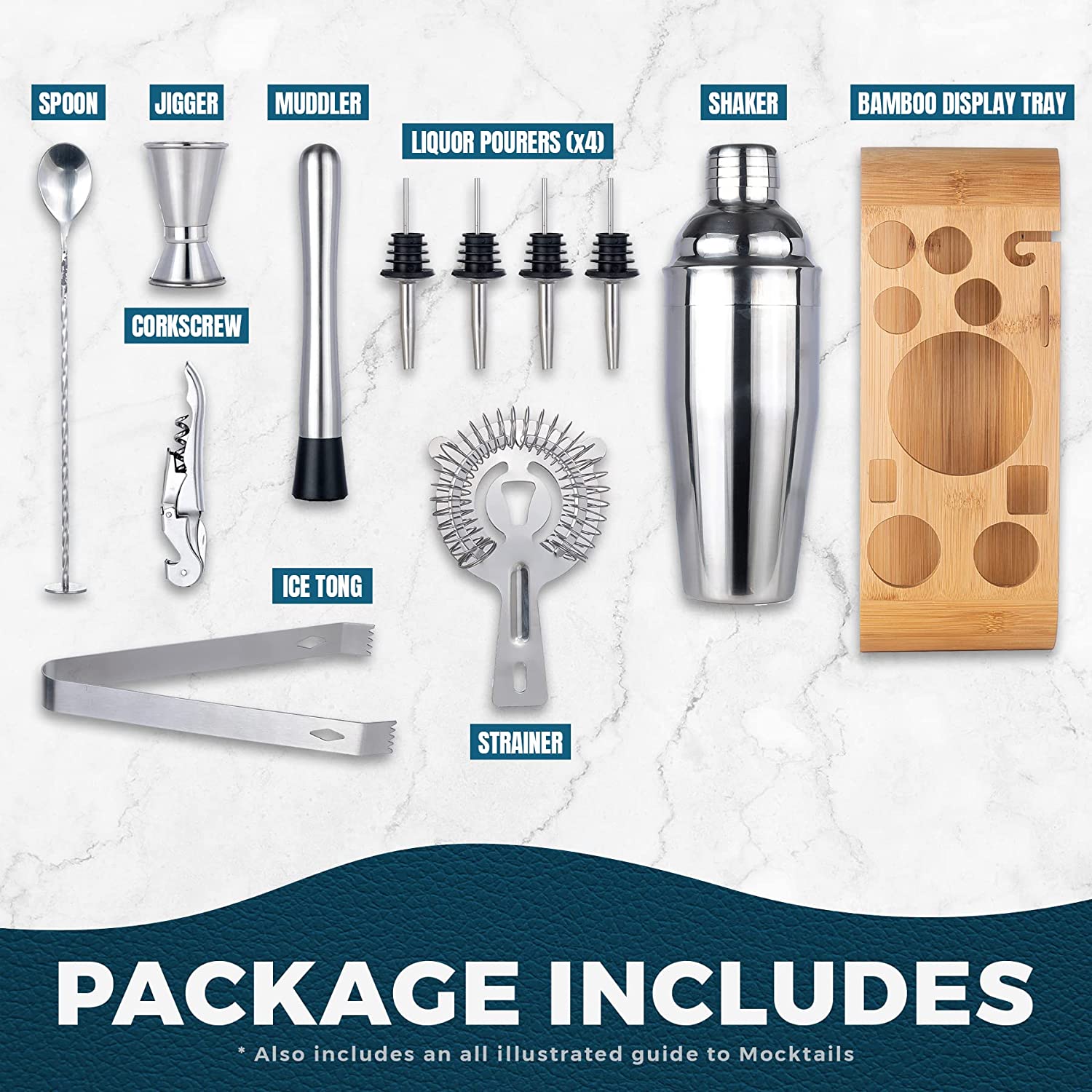 - Everything You Need (Except For The Booze): 12-Piece ALL-Inclusive bartender set of top shelf cocktail tools. Will give you the power to whip up impressive cocktails for your guests. Whether you're an amateur bartender or a professional cocktail mixing guru, whether you’re setting up a bar at home or at work, this bar set is a brilliant way to hit the ground running.