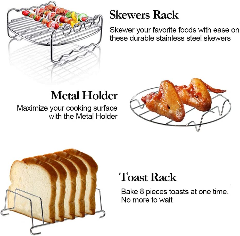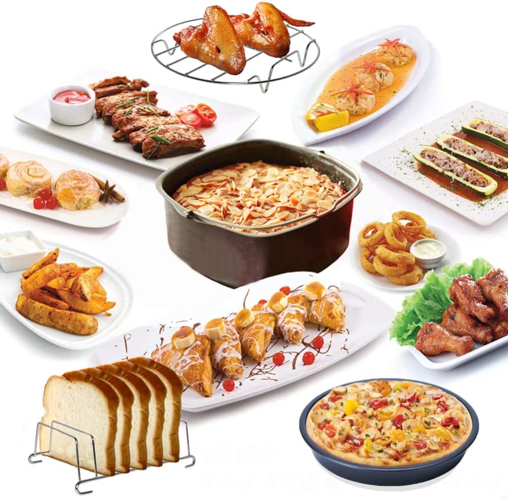 - Expand Your Cooking Dishes - If you love your Air Fryer, imagine that you can make more culinary masterpieces with our accessories set! Bake your favorite cake in the Cake Barrel, cook delicious pizza in the Pizza Pan, maximize your cooking surface with the Metal Holder and make skewers with the Multi-Purpose Rack! The gift cookbook will help you cook more dishes.