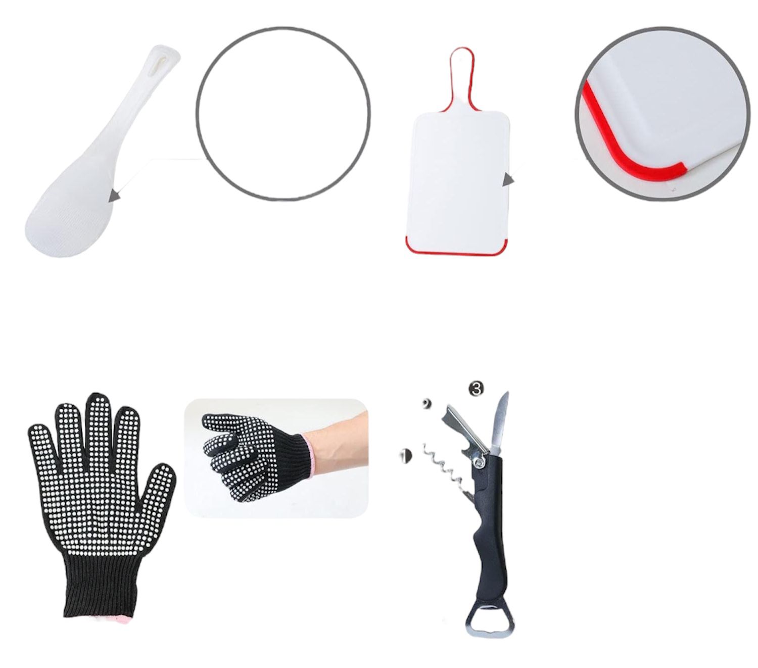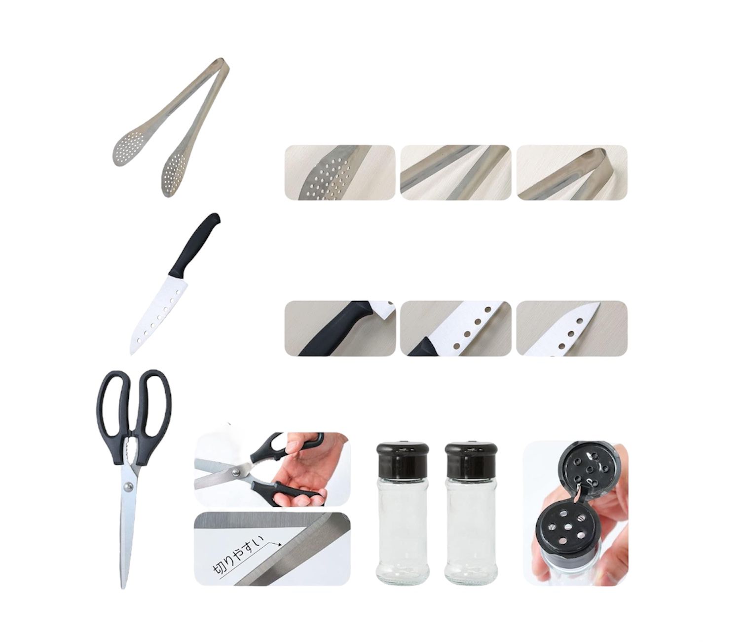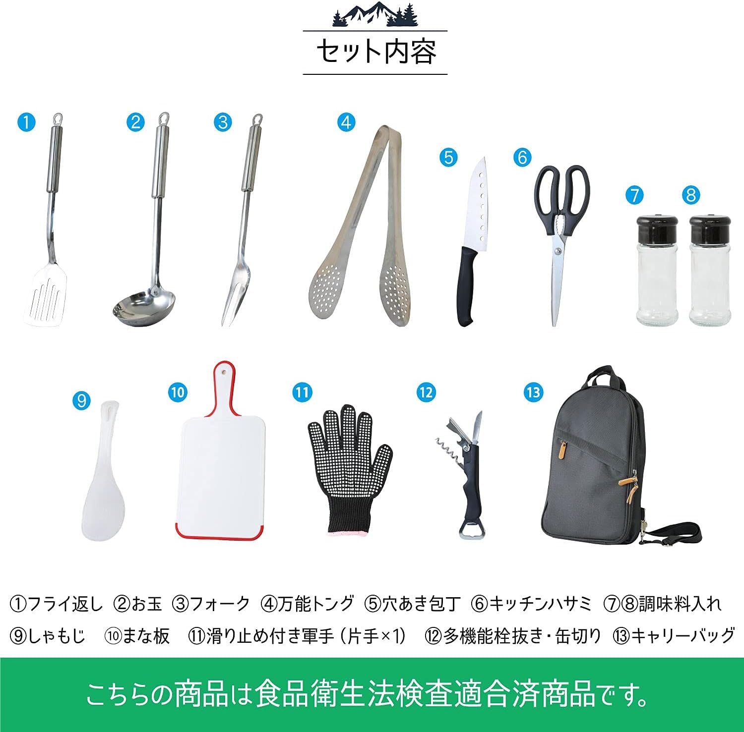 Ladle, spatula, rice spoon, perforated knife, all-purpose, tongs, cutting board, 2 seasoning containers, kitchen scissors, non-slip gloves (one hand x 1), multifunctional bottle opener, can opener, fork, carrying bag