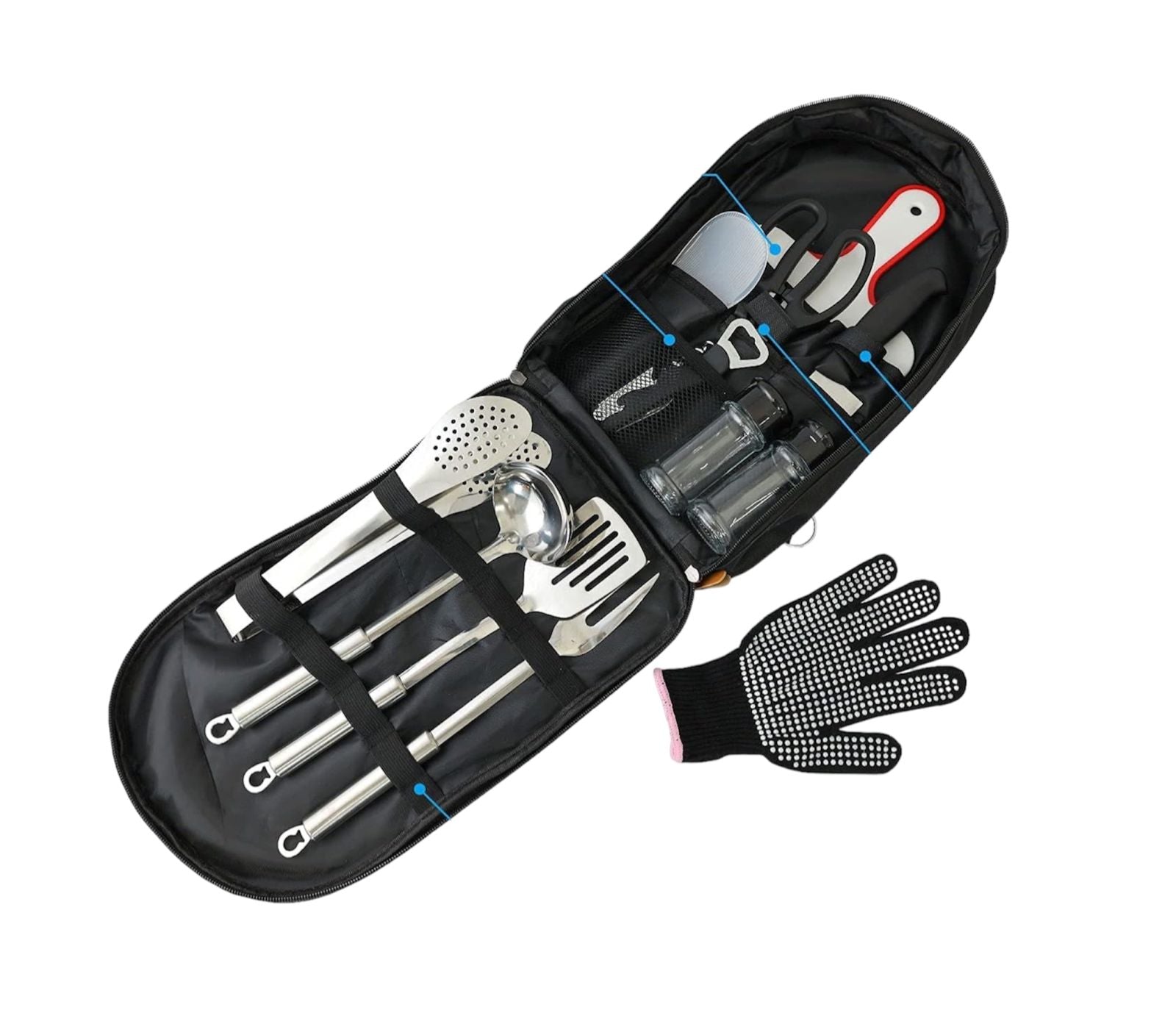 This 13 Piece Travel BBQ Tools Set is perfectly sized for all your grilling needs, all stored in a convenient, easy-to-carry bag! Equip yourself with all the necessary tools and accessories to cook to perfection. Get ready to master the art of grilling, wherever you may go.