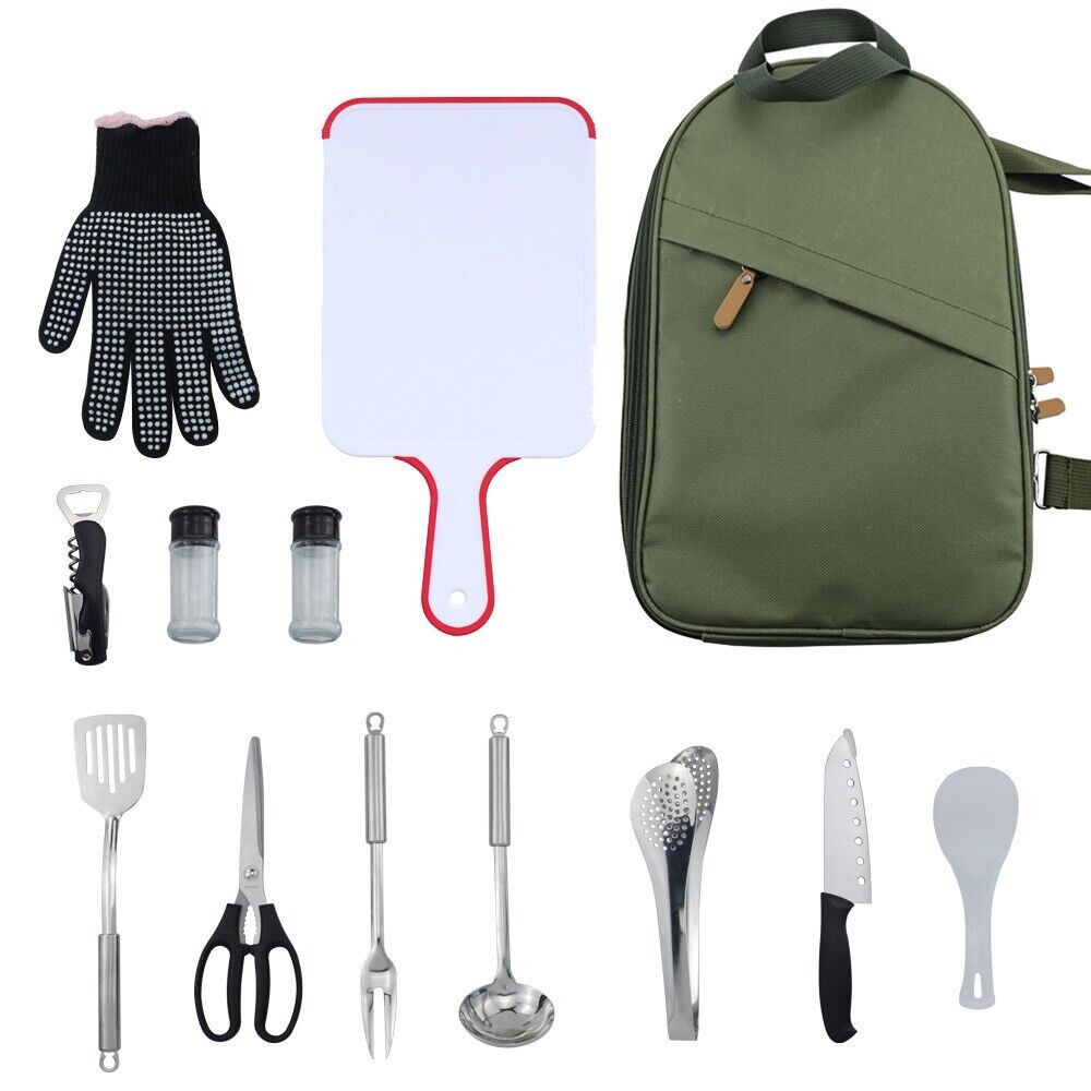 Enjoy outdoor cooking like never before with this 13 Pieces Travel BBQ Tools Set! Whether you're camping or having a backyard BBQ, this set has all the essential utensils you need to prepare and serve meals safely and with confidence. This set comes with a stylish and exclusive carrying bag for comfort and convenience with added pockets for easy storage. Enjoy delicious meals outdoors!