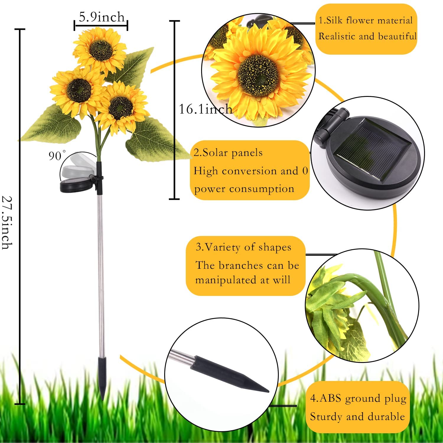 - Sunflower Solar Light】Sunflower solar power light is made of IP65 waterproof technology, which can prevent moisture and humidity. The stem is made of ABS plastic and stainless steel, which is durable and adjustable shape. Simulation of silk flowers, natural and lifelike appearance, will not fade over time, and will not wither