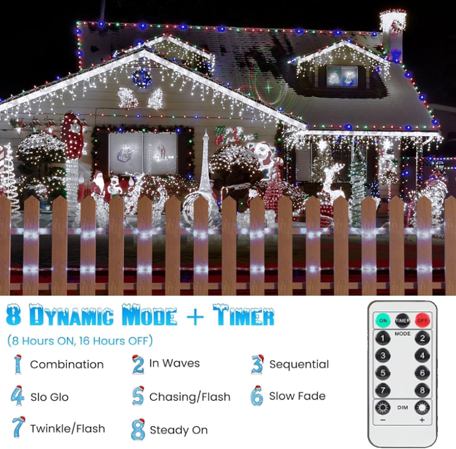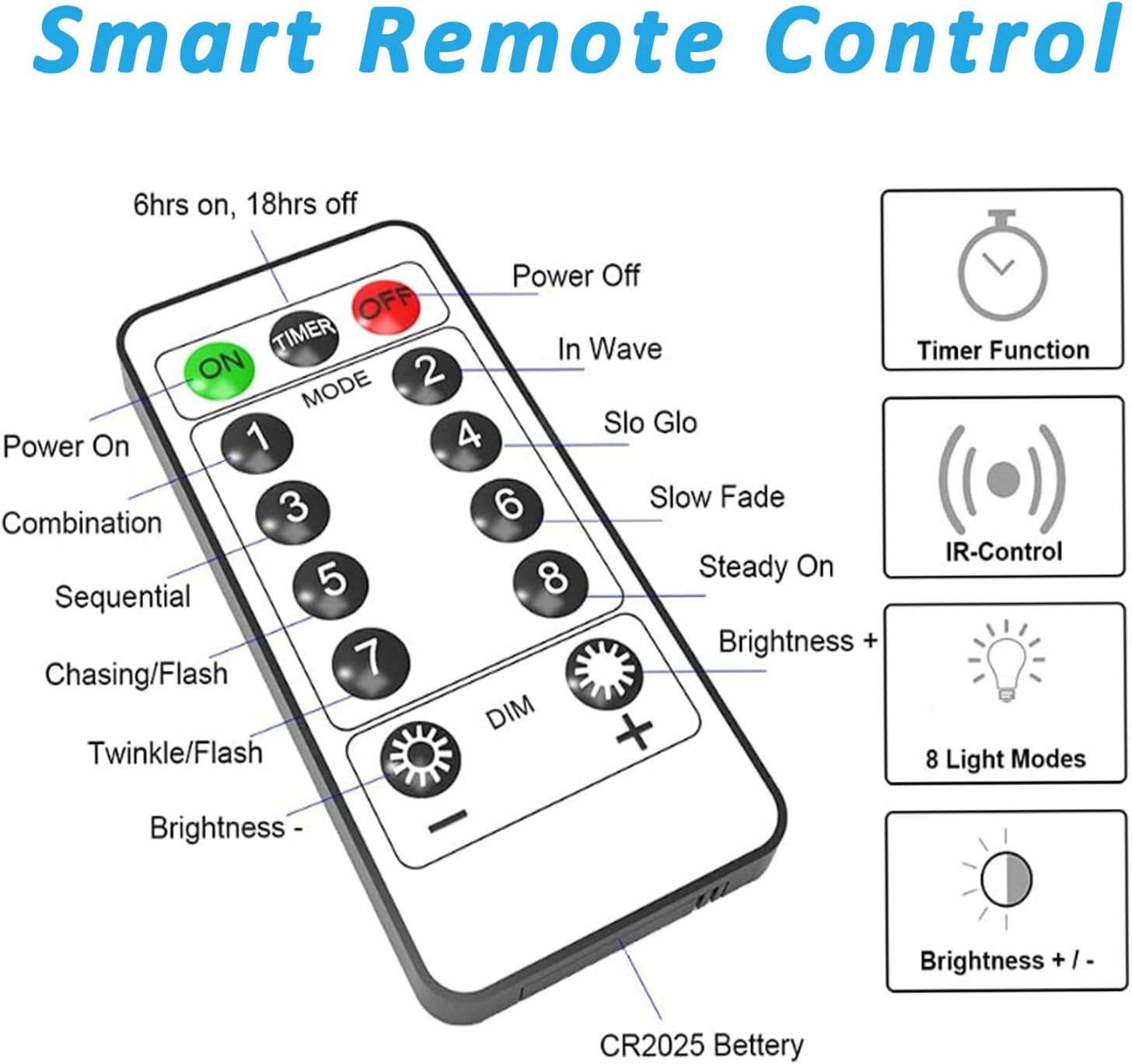 8 Lighting Modes: With eight adjustable lighting modes, you have the flexibility to create the perfect ambiance. Use the blue switch button or the included remote control to switch between modes. Whether you want a steady glow, a dynamic twinkle, or a playful chase effect, these lights have you covered.