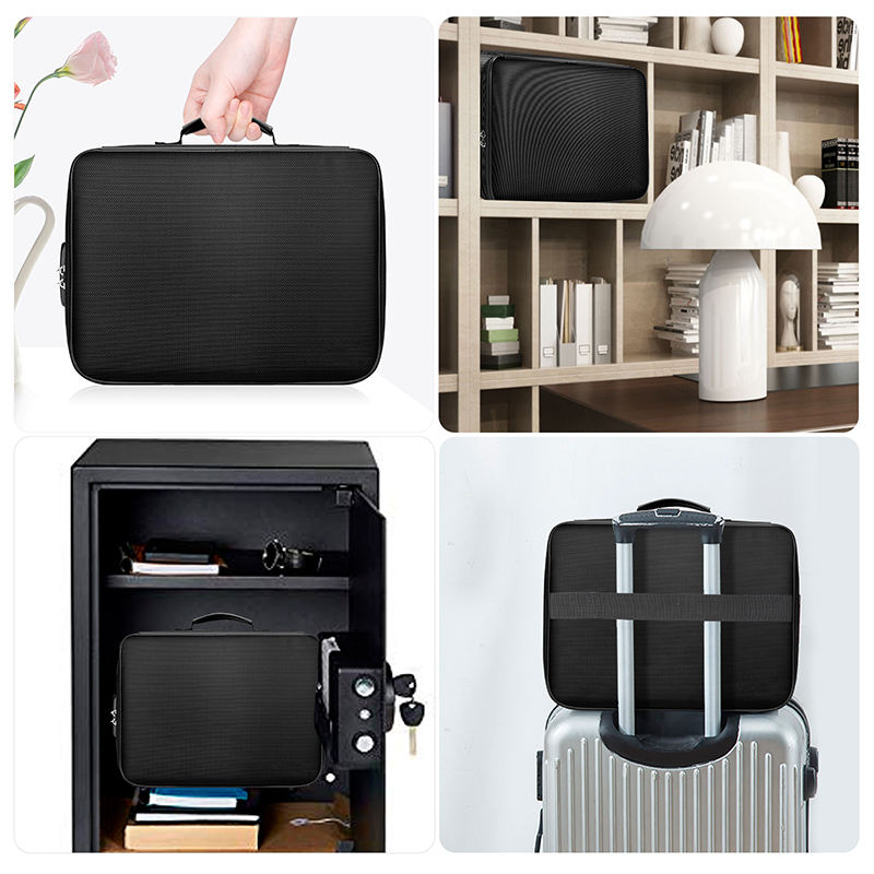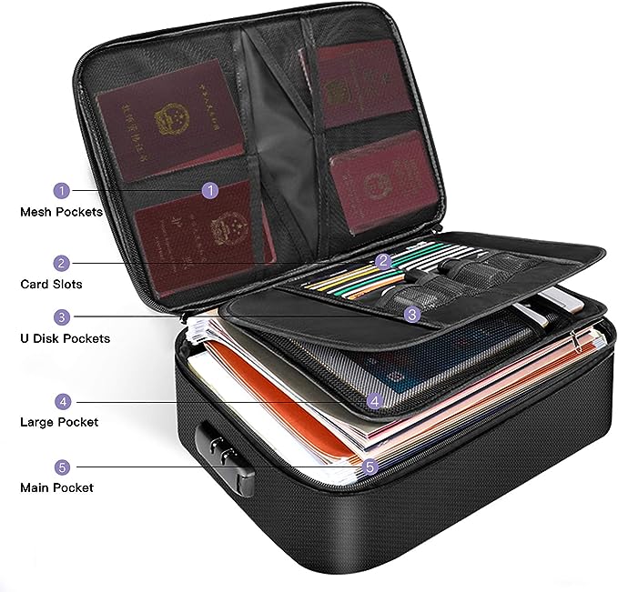 Secure your important documents and valuables with the 3-Layer Document Storage Bag with Password Lock. Featuring a fireproof zipper and safe lock closure, the spacious bag provides ample storage and protection for cards, passports, licenses, documents, files, money, U disk, letters, tablet, photos, and more. Enjoy peace of mind knowing your items are safe and secure.
