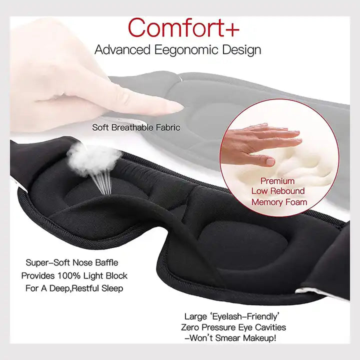 Experience cloud-like comfort with this 3D Memory Foam Sleep Eye Mask! The low-rebound memory foam reduces pressure and fatigue on the eyes for a luxurious, featherlight sleeping experience. You won't even feel it on your face! Adjustable straps ensure a perfect fit without entangling your hair, while the ergonomic contoured design, seamless shading, and large eyecups provide complete light blockout, allowing you to doze off with ease. Durable seams won't leave marks on your face so you can always get your beauty rest. Ideal for office naps, airplane travel, nighttime sleep and camping. Sleep soundly with this 100% light blocking mask!