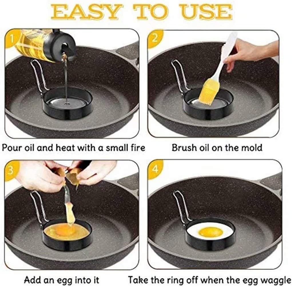 Anti-Scald Egg Rings 4 PackAdd-on design of Big Anti-burn Silicon Cover on handle; No finger burning; 4 Packs at a good price; Anti-scald & Non stick; foldable stainless steel handle; additional bonus: a silicon oil brush.Made of 304 stainless steel egg ring mould. Non-rusting, non-deformable, and eco-friendly. High-temperature resistant. Helps you to make a perfectly round sunny side up egg. Foldable Design & Easy to CleanRemovable stainless steel handle for easy cleansing; just soak it in water for 10 mins and use a piece of dish-washing cloth with some dish soap to wash the ring with great ease. Foldable handle for saving space. Size: 2.95 inch in ring diameter; 0.78 inch in ring height.Such A Perfect Round Egg For centuries, ancient books have it that all round-shaped things are believed to bring good luck & happiness. A circle stands for perfection, reunion and success. A sweet breakfast with a perfect round fried egg embraces you with all-day good mood for better performance in work/study. Easy to Use① brush oil to the inner side of the ring, simple way for non-stick purpose. ② put the egg ring into an evenly-placed fry pan and add some oil into the ring with low heat for no leaking of egg white. ③ Break an egg into the ring. ④ Cook with low heat over 3 mins and a wonderful lucky fried egg is done! Multi-Functional Tools - Ideal for sunny side up eggs, burgers, breads, pancakes, and omelettes. Deep enough to add herbs, cheese, ham, and bacon. Use your creativity to try different recipes!