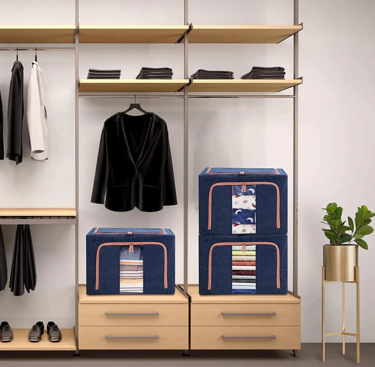 Inside, a set of alloy support poles ensures the box stands upright and maintains its shape when unfolded—offering a rigid, sturdy structure that won’t collapse under weight. With a generous 64-liter capacity, it’s ideal for storing clothes, bedding, accessories, or seasonal items. Washable and collapsible, it’s perfect for compact living spaces, closets, or under-bed storage.