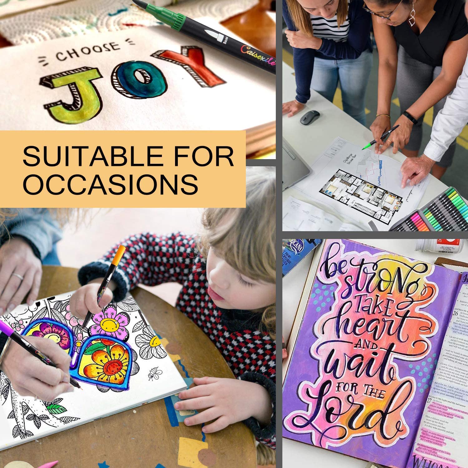- DUAL TIPS: 1-2mm Brushes tip allows you easily laying down thick, thin, or varied lines in one stroke, works well for coloring books, signing, design, art project and hand lettering; 0.4 mm fine point tip is great for outlining, detail and drawing. These double-end markers are a must for your next masterpiece 36 UNIQUE COLORS: dual brush pens have 36 vibrant colors and Color coded pen holder easier to choose right color every time. Also every pen comes with water-based, vibrant rich ink which will arouse your artistic creativity HIGH QUALITY: All brushes and fineliner work well with no skipping or ink flow issue. Especially, the nylon fiber brush tips would easily layer and mix different colors without worrying about smudges and blotches PERFECT GIFT IDEA: Our colored markers are good for your everyday lettering, drawing, crafting, doodling, illustrations and fine art
