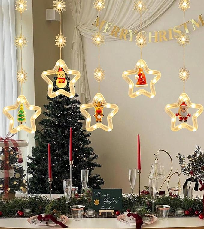 Transform your windows into a festive showcase with the Festive Star Christmas Curtain String Lights, featuring 120 LEDs, 10 glowing star rings, and 10 charming 3D Christmas figurines. From Santa Claus to snowmen and reindeer, each ornament adds warmth and whimsy to your holiday décor.