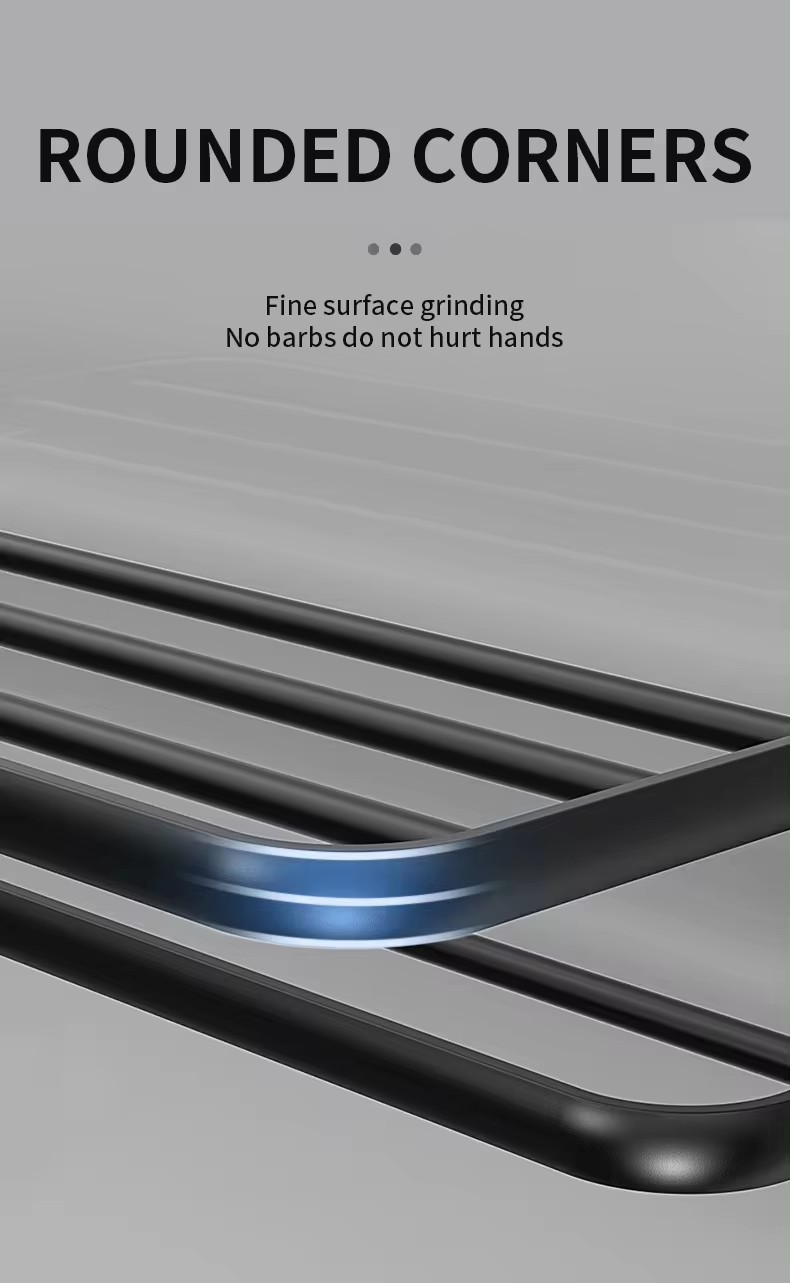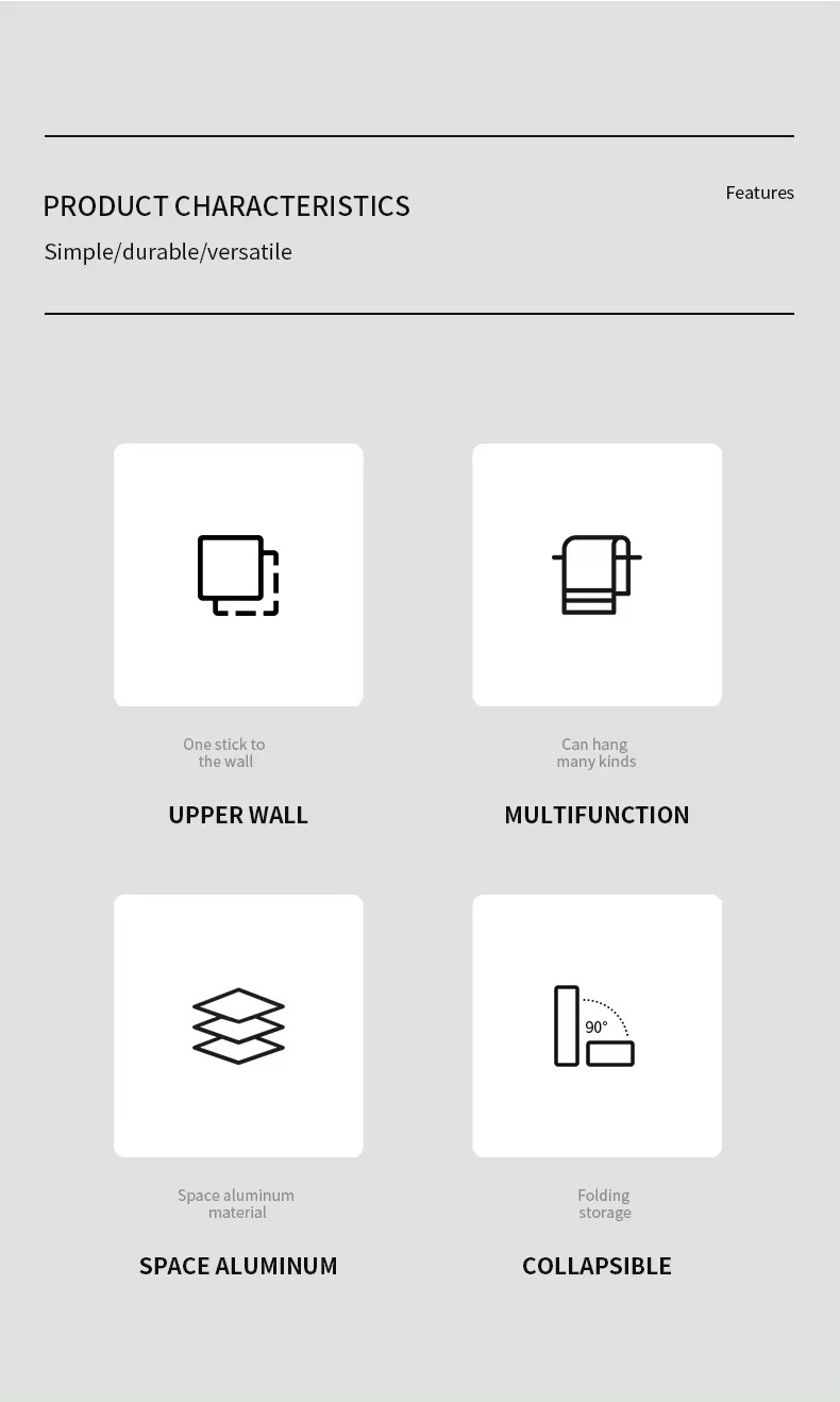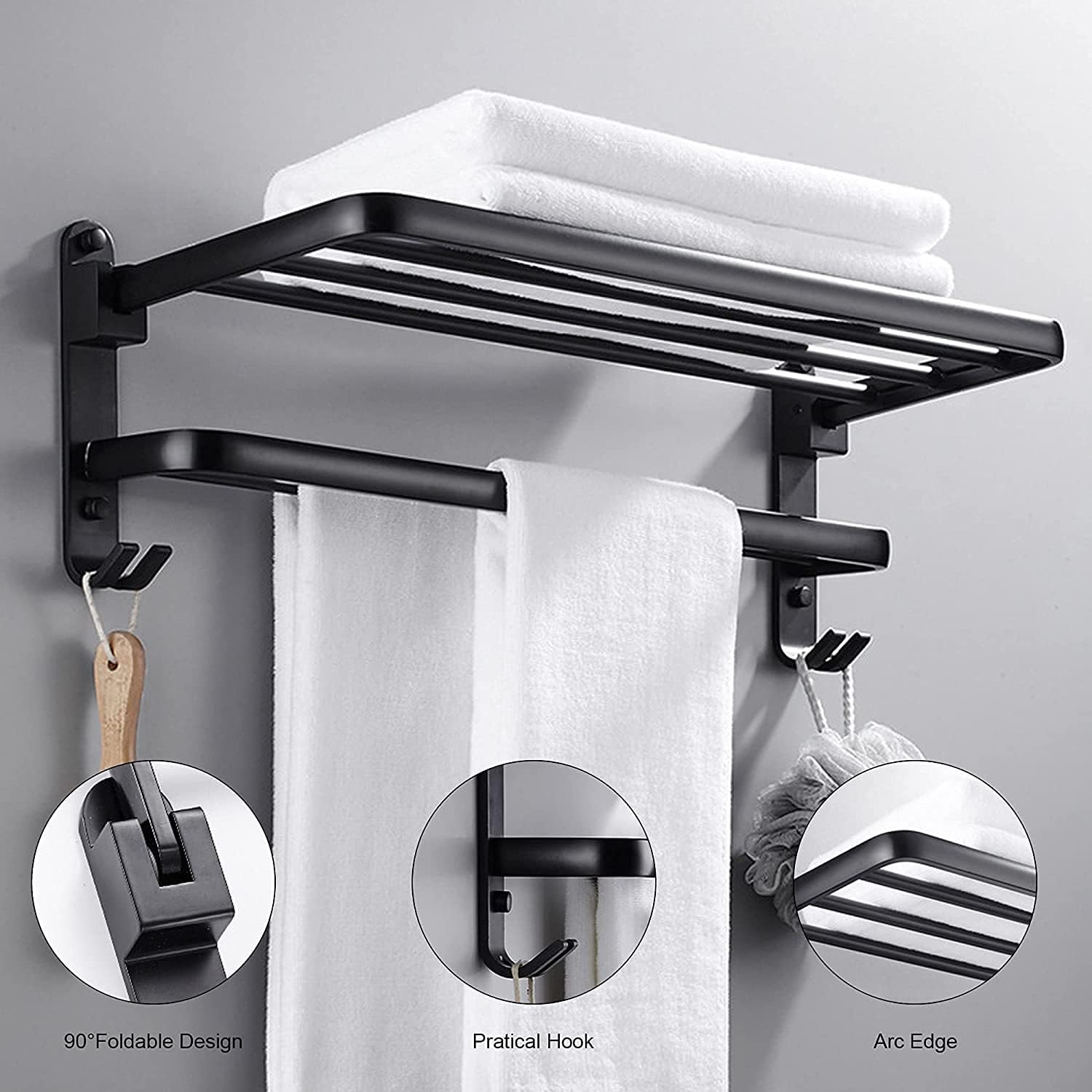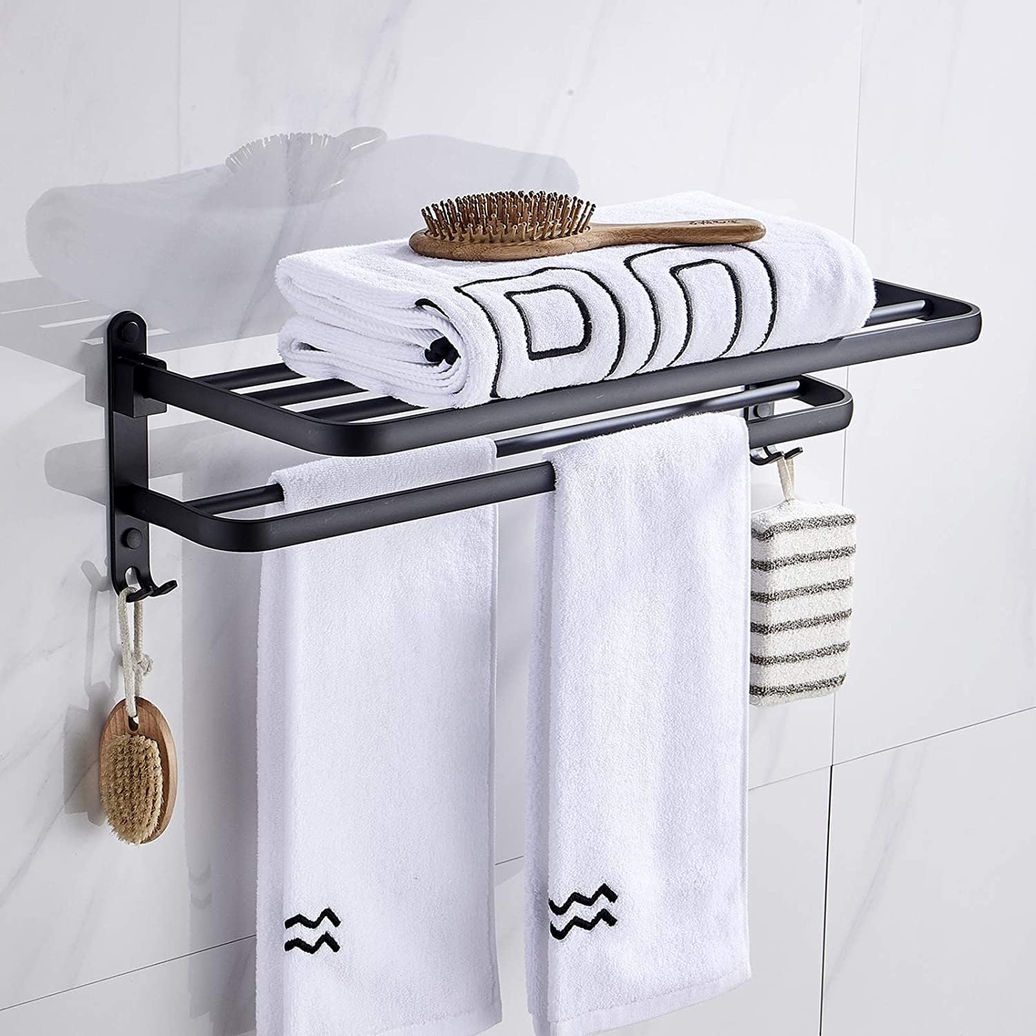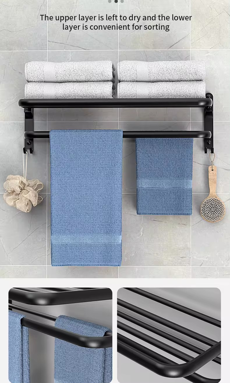 Constructed from high-quality space aluminum with a matte black finish, this shelf is designed to withstand daily wear and tear, as it is resistant to scratches, corrosion, and tarnishing. It can be easily installed using screws and anchors included in the package, or by using adhesive glue for a quick installation. This 90° foldable towel rack features 2 towel bars and 2 hooks, providing efficient and practical storage for bath towels, bath balls, and other bathroom items. It is a perfect addition to any bathroom, bedroom, balcony, or closet. This modern and sleek design is commonly used in both contemporary homes and hotels to neatly organize and hang face towels, bath towels, and clothes.