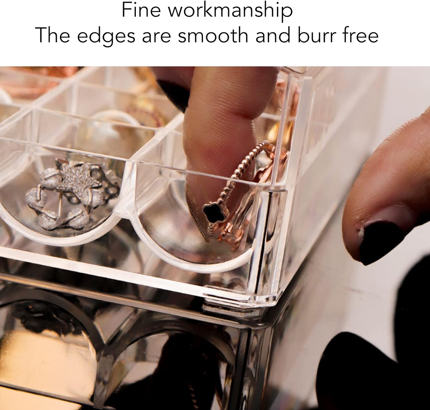 Organize and protect your treasured jewellery with the 3 Layer Crystal Acrylic Jewellery Organizer! This compact organizer offers 38 compartments, a dustproof design, and a portable size for easy storage and display of your earrings, rings, and more. Never lose your favourite pieces again - get yours today! Show off your jewellery in style with this 3-layer organizer. It's perfect for saving space and keeping your room tidy, making it an ideal gift for any jewellery lover. Keep small items like accessories, earrings, and rings neatly organized with its separate storage units. Whether you're traveling or just need a convenient storage option, this organizer has got you covered! Keep your jewellery in pristine condition with the 3 Layer Crystal Acrylic Jewellery Organizer. Its durable acrylic material and dustproof cover design prevent oxidation and maintain the shine of your jewellery. Say goodbye to dust, scratches, and messy pieces with this essential accessory for any jewellery collection. Keep your jewellery organized and within reach with the sleek and sturdy