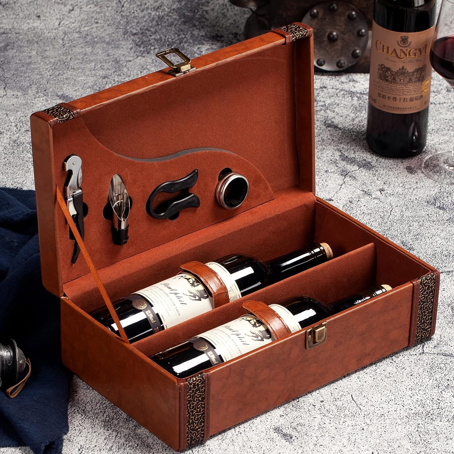 Wine accessories : 1 x corkscrew, 1 x foil cutter, 1 x pourer and 1 x stop drip ring.(Wine bottles and wines are not included)
