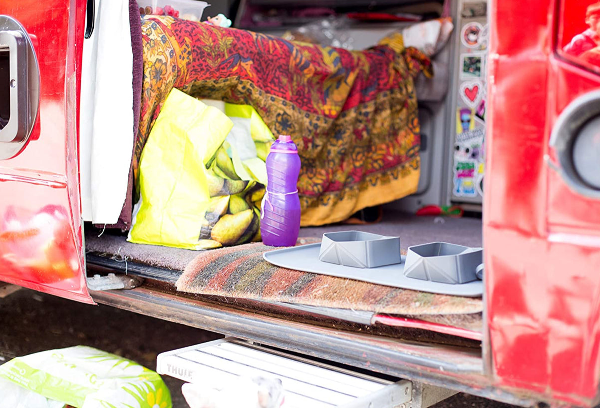 - ? PORTABLE DESIGN FOR 'ON THE GO' ? Our unique patented fold down design Rolls up in seconds to the size and shape of a newspaper! Simply clasps together to make a compact portable pet bowl and mat for wherever you want to go with your dog (or cat!). Includes a handy water resistant carry case. Can be carried , tied to a rucksack, popped in a bag and fits in any car glovebox.