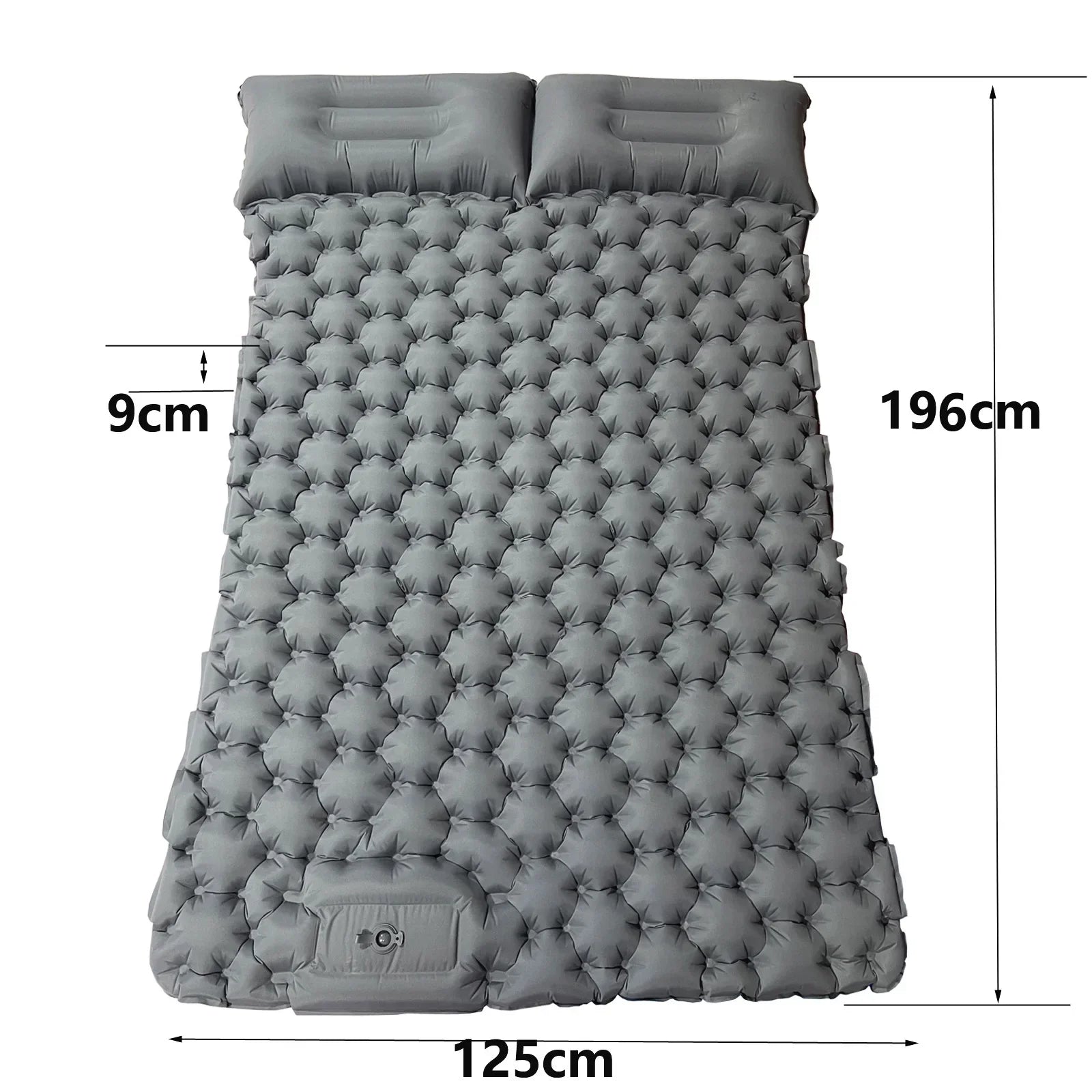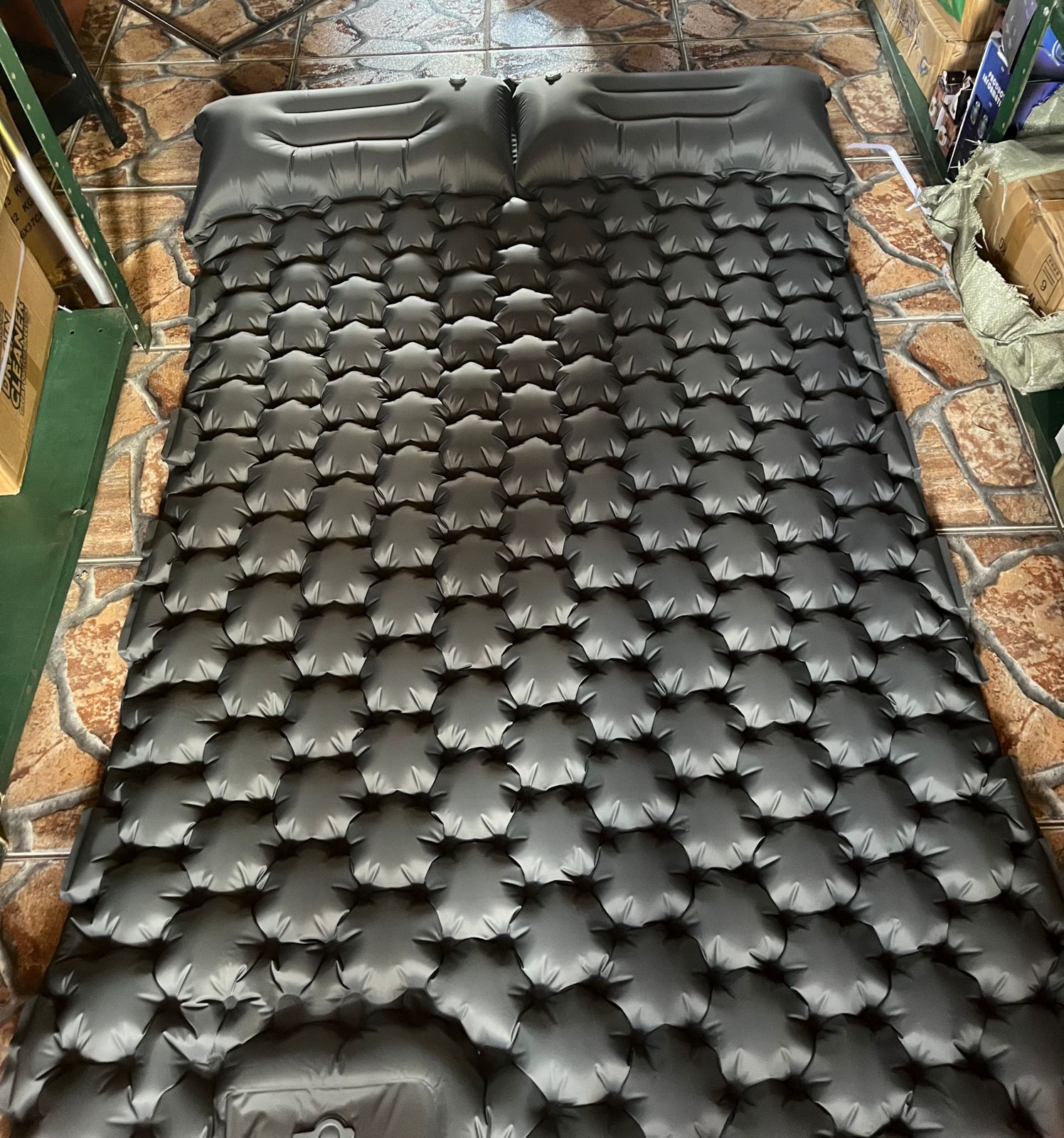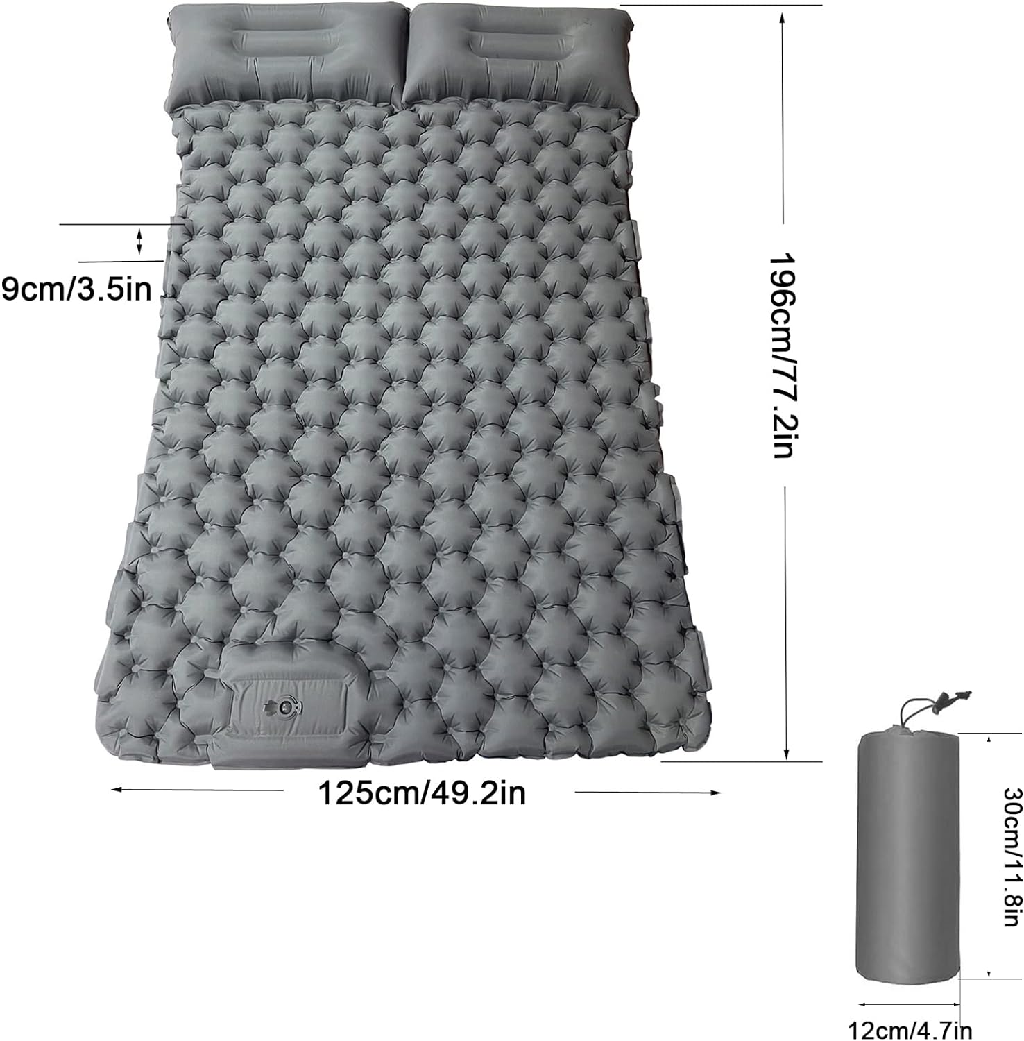 Constructed with lightweight, skin-friendly TPU nylon fabric that's water-resistant and durable, this 2 person sleeping pad is perfect for any tent, lawn, or beach. With no pump required, the 1 inflation valve and 2 deflation valves make it easy to inflate and deflate. Plus, the raised points and air pillow offer amazing comfortable support for the body and head. On top of that, our double camping mat is ultra-light and compact - weighing in at just 1.4 kg and with a foldable pack size of 30 x 13 cm , making it ideal for camping, backpacking, and hiking! Make it the perfect companion for any outdoor adventure. Providing 10 cm of comfort like a bed, our  camping mat has insulating properties to keep you warm from the cold floor, damp ground, and hard stones.