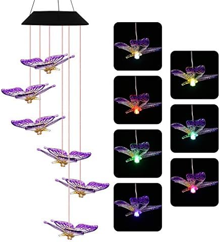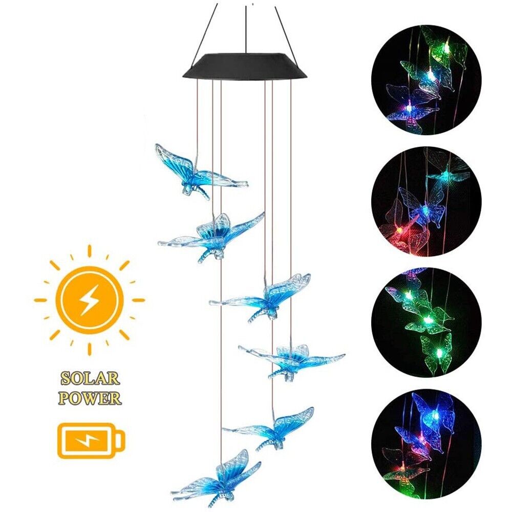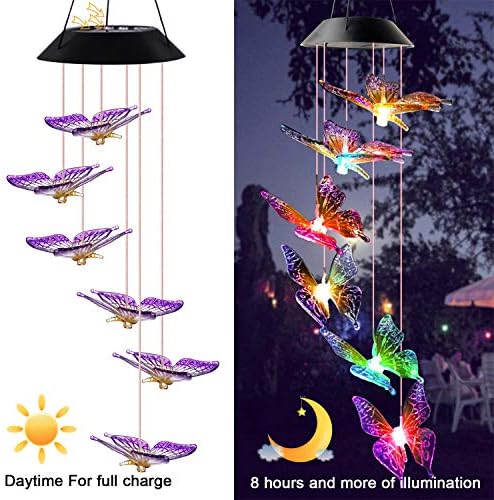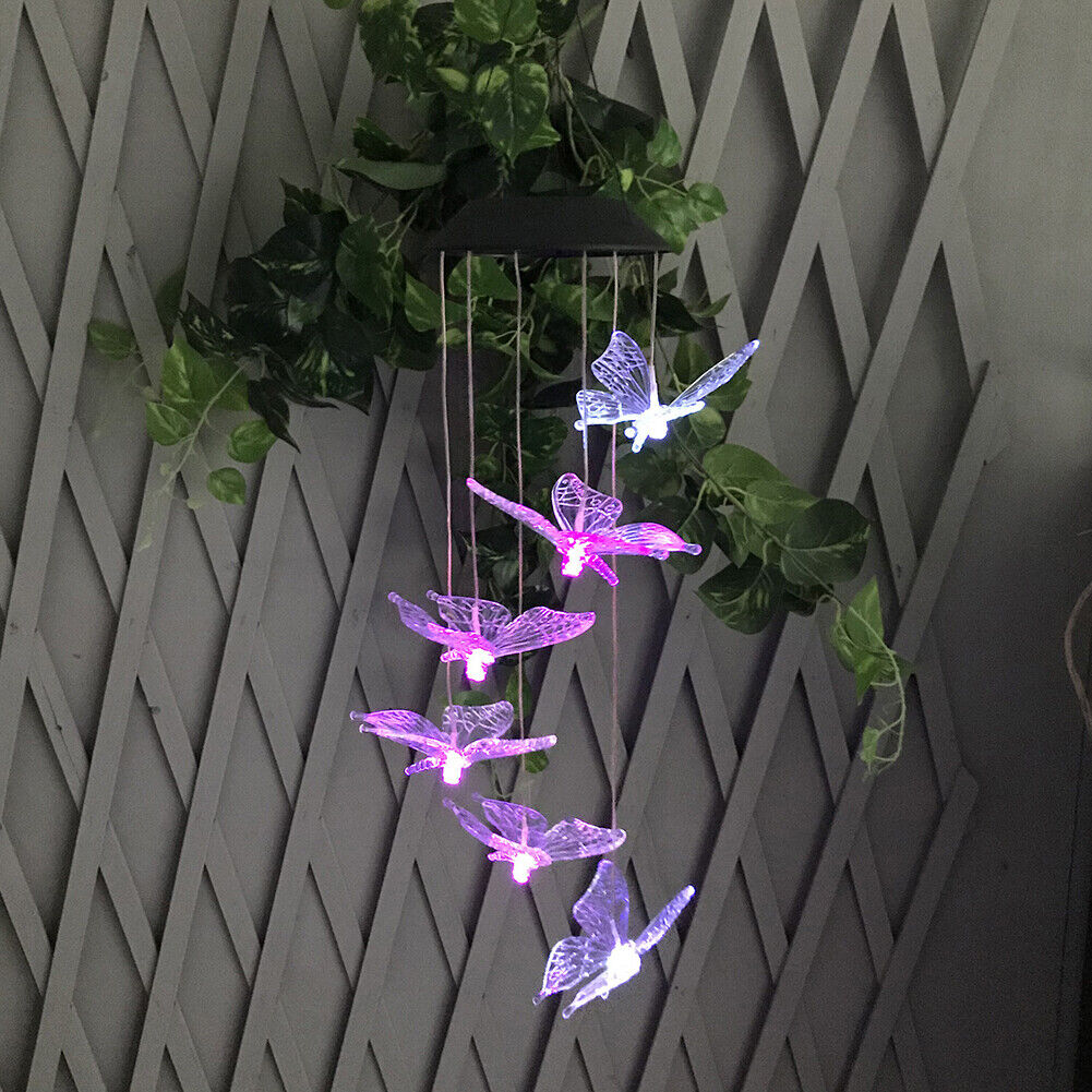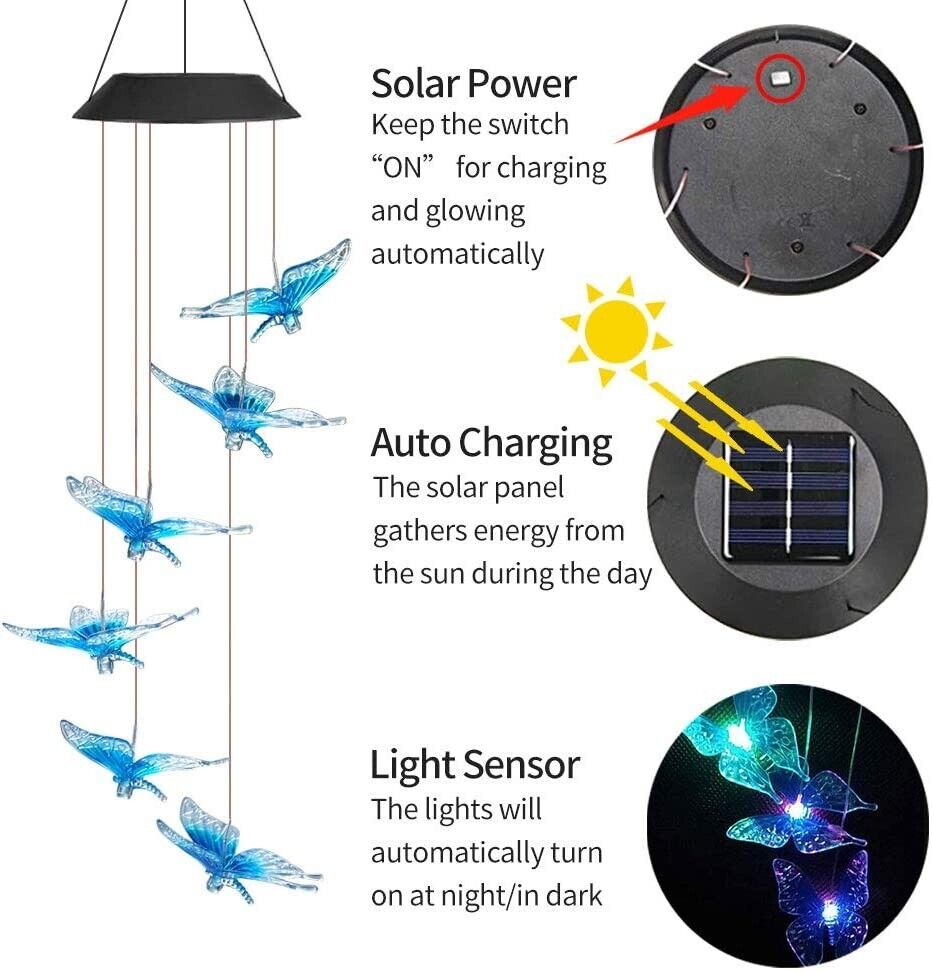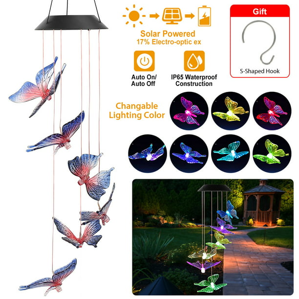- Hanging chimes with solar-powered color changing LED glow .Solar LED Lights change colors alternating randomly between 7 color changing LED bulb illuminating the crystals at night, calmly and softly changing from one color to the next. more eye attracting and more charm.