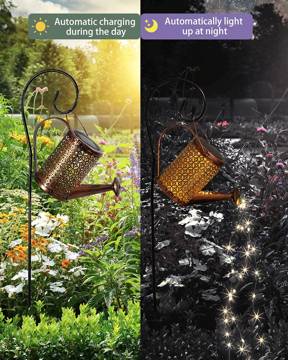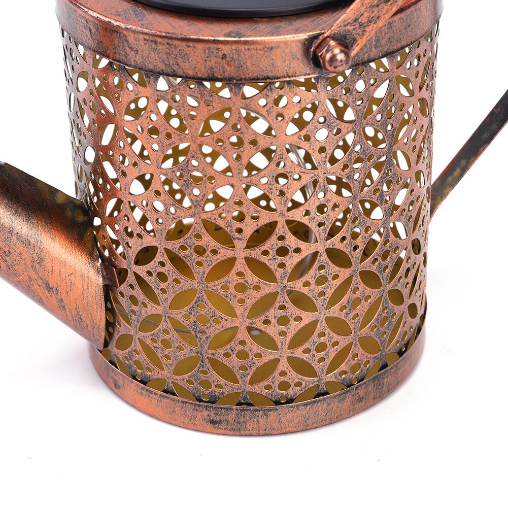 Create an enchanting outdoor atmosphere with this Solar Watering Can with LED Lights! This metal watering can is decorated with a unique hollowed design, allowing the string of LEDs to shine through for a captivating, water-like lighting effect. Hanging the 32-inch crook hook is a breeze, and the 600 mAh battery ensures this light lasts for 6-8 hours when fully charged. Let your garden sparkle under the stars!