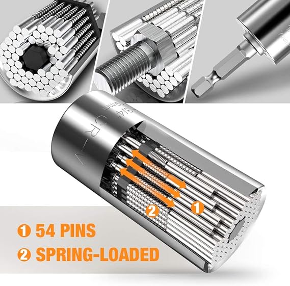 Each universal socket wrench adapter contains 54 individual hardened steel spring pins that enable the tool to conform to the shape of and grip hex nuts, hooks, bolt heads, and other objects. Fantastic universal socket combines durability and performance.