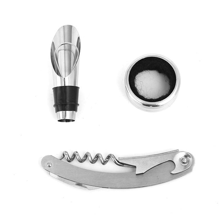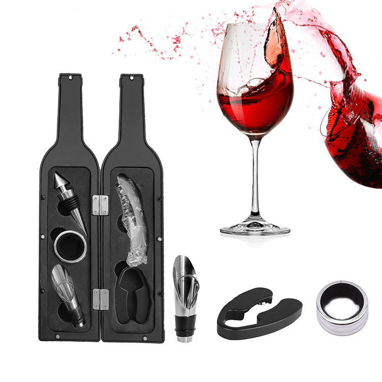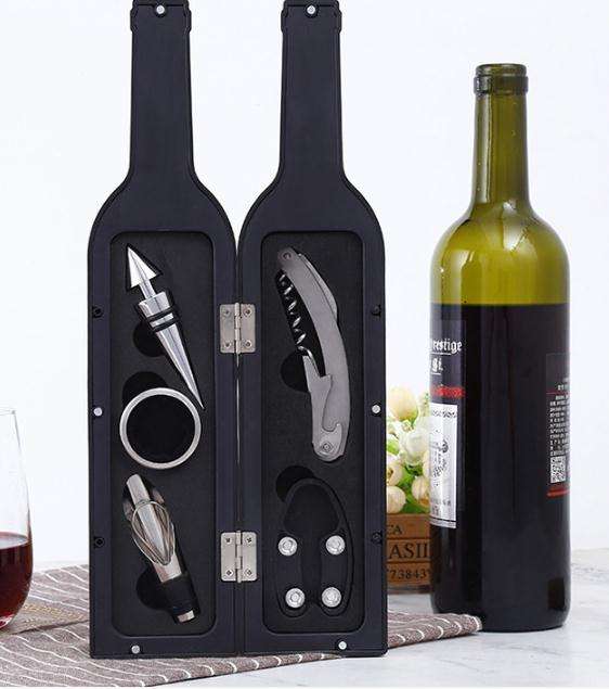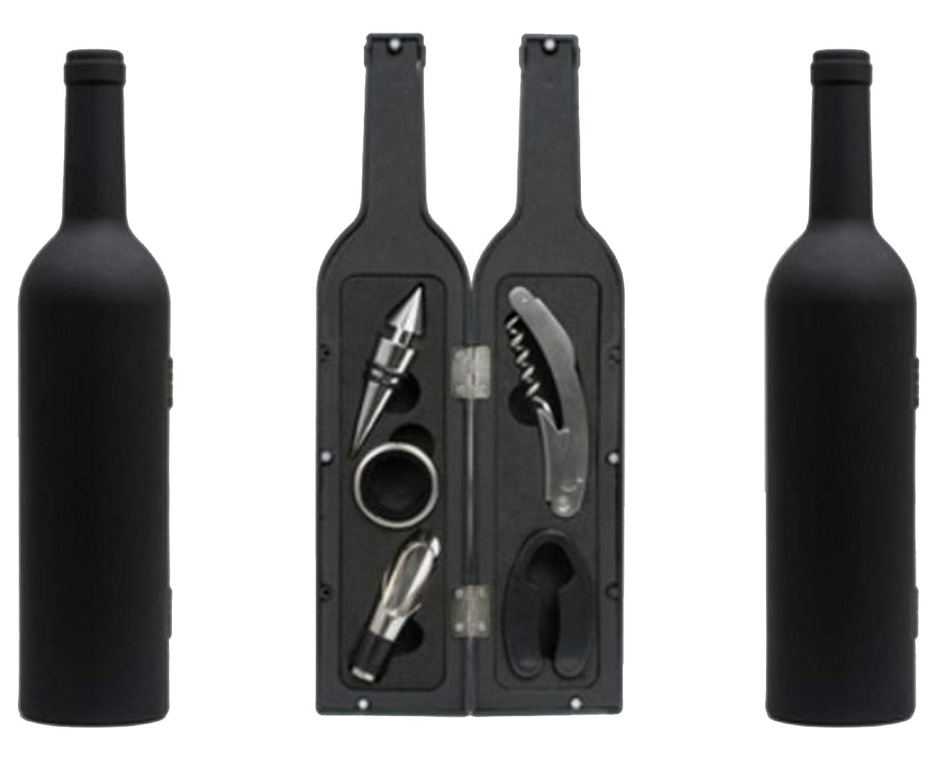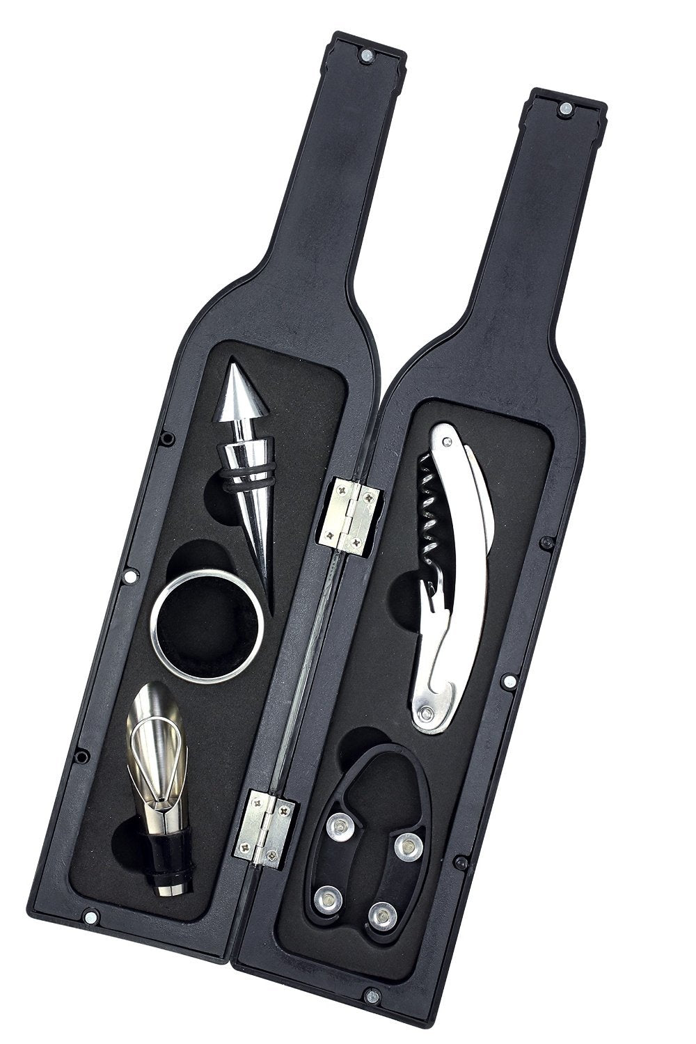 - Wine bottle opener set featuring 5 pieces every wine lover needs in their collection, the corkscrew is made of double-reinforced metal alloys, while the stopper, pourer, and drip ring are all made of stainless steel for easy cleanup.